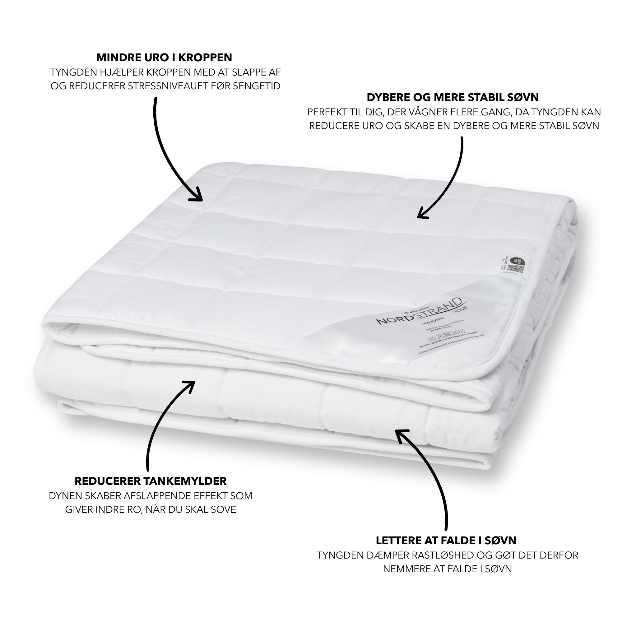 En tyngdedyne, som denne, er produceret til at skabe større kropslig ro hos dem hvor det ikke altid kommer naturligt. Dynen er fyldt med bittesmå og meget fine glasperler, som giver dynen sin vægt og tyngde. Denne vægt skaber et trygheds element for krop og nervesystem, som derved giver kroppen bedre mulighed for at slappe af. Nogen bruger tyngdedynen hver dag hele natten, andre bruger den i perioder eller kun til at falde i søvn.